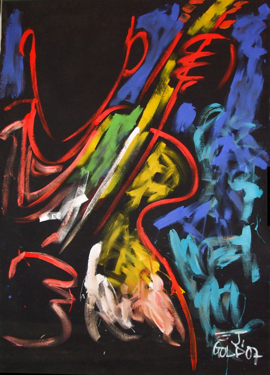 E.J. Gold is a jazz musician who paints monumental canvasses for jazz concert installations, such as Wynton Marsalis, Toots Thielemans, and Oscar Peterson, Marian McPartland and others at the International Association for Jazz Educations' [IAJE's] concert stages in Toronto, New York and Long Beach. His Jazz Greats portraits travelled across the United States with the Harlem Renaissance show and have appeared at Jazz at Lincoln Center and the Hollywood Bowl. His portrait of Herbie Hancock is in the permanent collection of the National Museum of American History. Gold is one of the founders of the Grass Valley Graphics Group and the School of Reductionism. His art is collected by hundreds of individuals and museums, including celebrity collectors Bill & Hillary Clinton, the late King Hussein of Jordan, actors Curtis Armstrong and Catherine Oxenberg, the late Harry Nilsson, Miss Peggy Lee and Billy Barty.